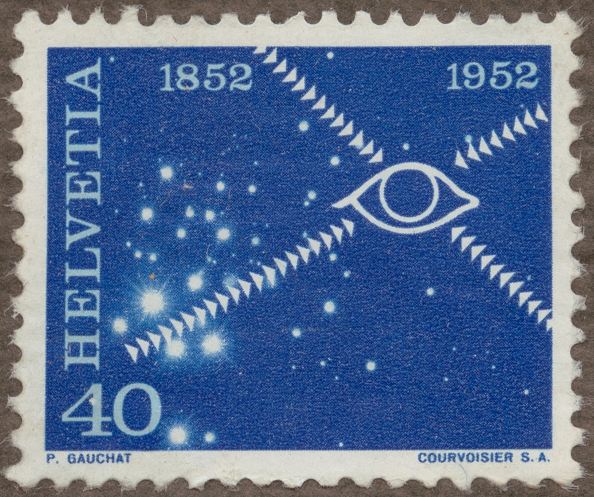 Frimärke ur Gösta Bodmans filatelistiska motivsamling, påbörjad 1950. Frimärke från Schweiz, 1952. Motiv av Televisionen "Symbolisk bild Serie: 100 år av telekommunikation 1852-1952