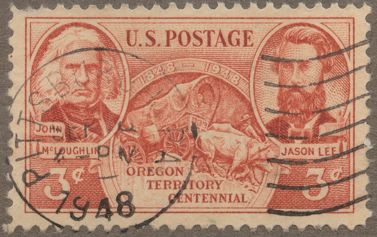 Frimärke ur Gösta Bodmans filatelistiska motivsamling, påbörjad 1950. Frimärke från USA, 1948. Motiv av Emigrationstransport i oxvagn mot väster i USA. ":-"Oregon Trail". Porträtt: John Mc Loughlin. Jason Lee. 100-årsminne av territoriet Oregon."