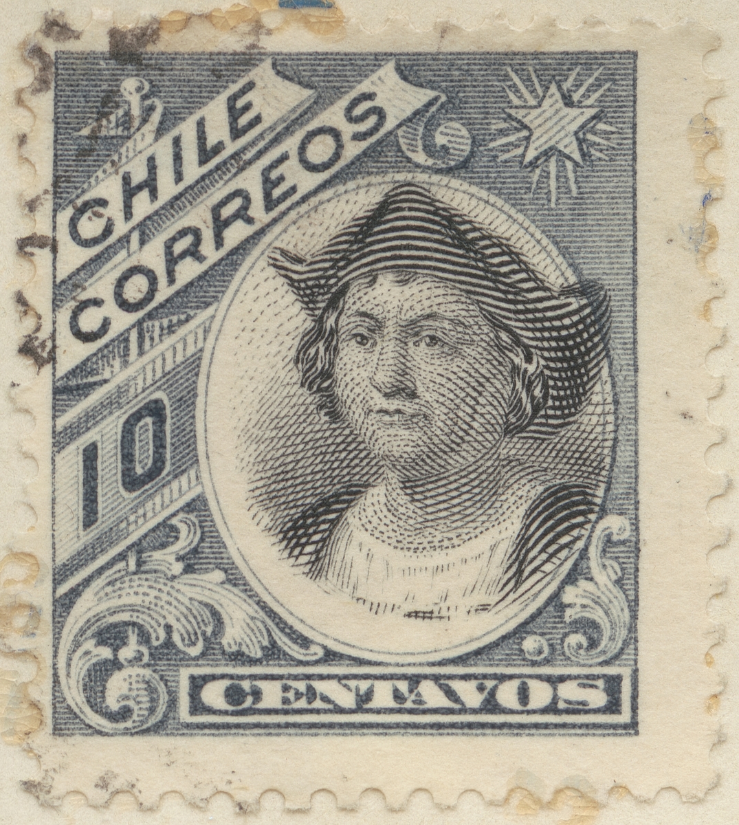 Frimärke från Chile, 1905. Motiv av Christopher Columbus 1446-1506 -1492 första resan över Atlanten-