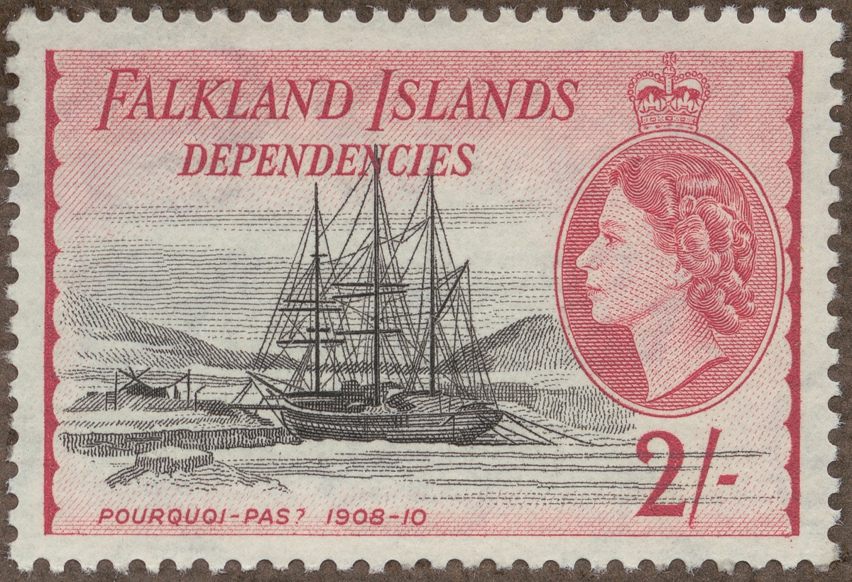 Frimärke från Falklands Öarna, 1954. Motiv av "Pourquois pas? IV" Sydpolarfartyg 1908-1910. Jean Charcot (fransman). Arkipelagen väster om Graham Land. Upptäckte Marguerite Bay, kartlade Fallières Land. Upptäckte Charcot Ön. Kom till 70 S.