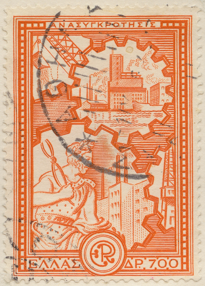 Frimärke från Grekland, 1951. Motiv av Kugghjul -Fabriker- "Serie: propaganda för Greklands återuppbyggning under Marshallplanen."