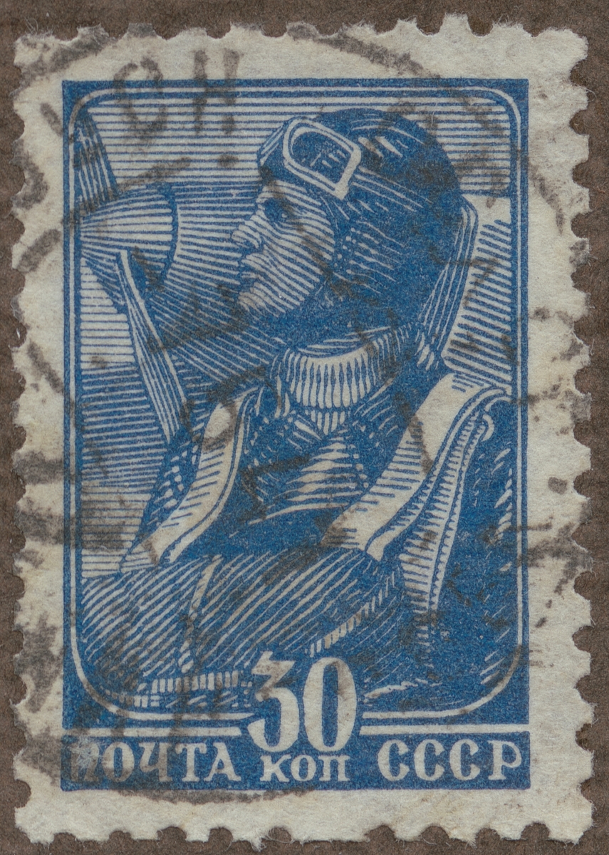 Frimärke från Ryssland, 1939. Motiv av Rysk flygare "- Minne om Soviet:s Luftfarts Dag den 18 augusti 1939-"