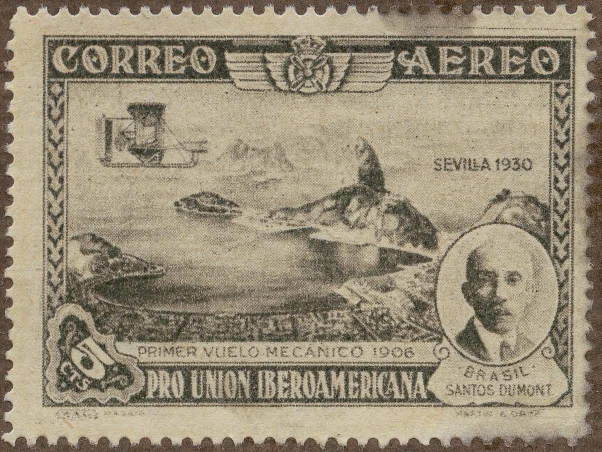 Frimärke från Spanien, 1930. Motiv av Biplan med vilken Brasilianaren Alberto Santos-Dumont f. 1873- d.1932 (t.h.) gjorde sin första motordrivna flygning d. 23 oktober 1906 på Bagatelle övningsfält, Paris. D. 12 november s. år flög han över samma fält 220m. på 21 sek. "-Vue över Rio de Janeiro bukten-"