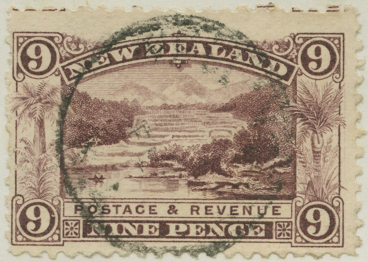 Frimärke ur Gösta Bodmans filatelistiska motivsamling, påbörjad 1950. Frimärke från New Zealand, 1898. Motiv av De skära sinterterrasserna: Rotomahana