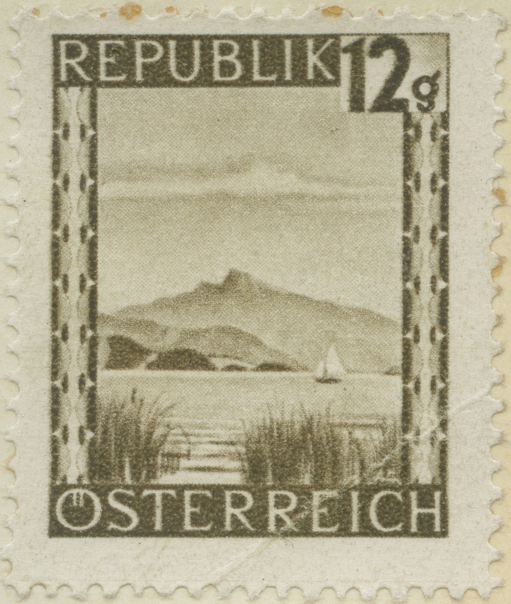 Frimärke ur Gösta Bodmans filatelistiska motivsamling, påbörjad 1950. Frimärke från Österrike, 1945. Motiv av Schafberg vid Mond Sjön