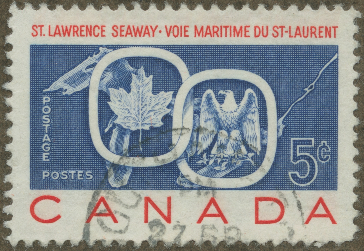 Frimärke från Canada, 1960. Motiv av St. Lawrence Seaway: "Maple leaf", Kanadas nationella emblem, på bakgrund av Lake Michigan, Lake Superior o. Lake Huron (t.v.). USA.s nationella emblem: örnen på bakgrund av Lake Erie o. St. Lawrence River. (t.h.) - Symbol för kanadensisk och amerikansk samarbete vid invigning av s.k. "St. Lawrence Seaway."