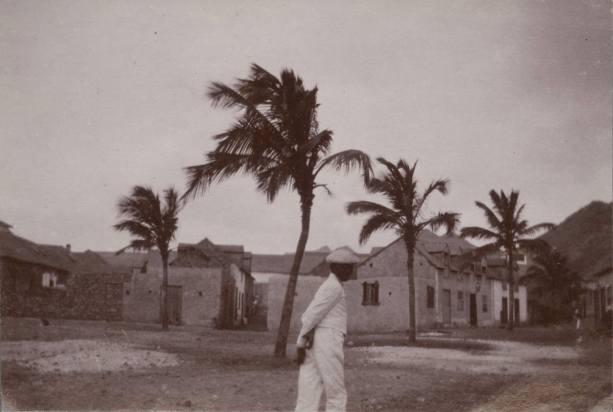 Fotografi från första svenska Antarktisexpeditionen 1901-1904. Motiv av man framför ett antal stenhus och palmer.