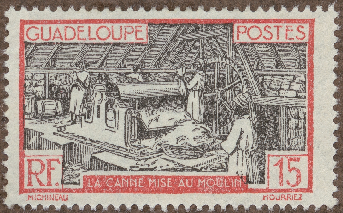 Frimärke från Guadeloupe, 1928. Motiv av malning av sockerrör.