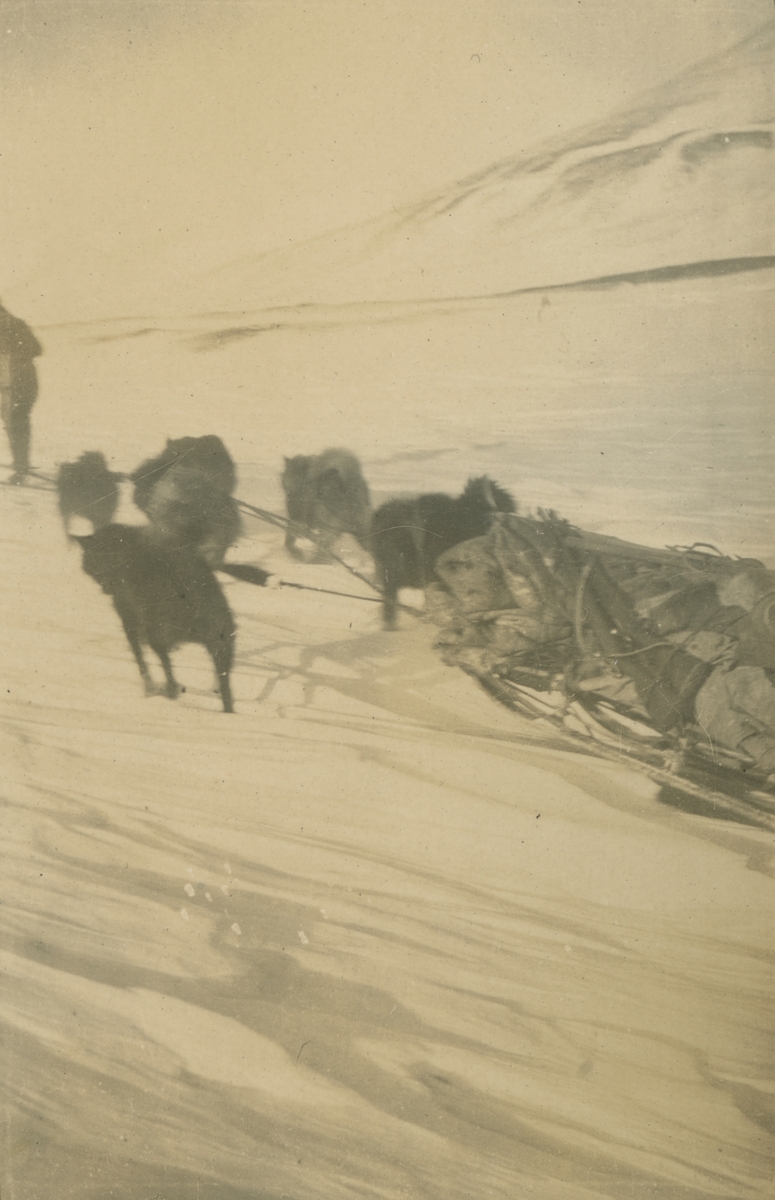 Fotografi från expedition till Spetsbergen. Motiv av hundspann och släde i snön.