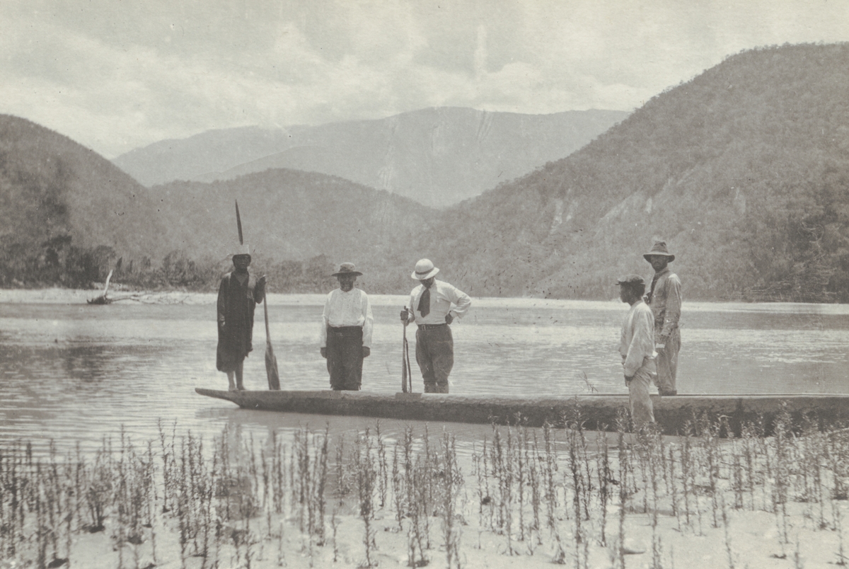 Fotografi från kuvert märkt med "Ernst Nordenskjöld". Motiv av expeditionsdeltagare i kanot vidi flod i djungel.