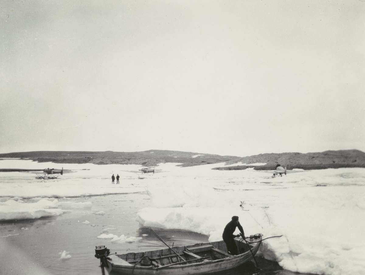 Fotografi från svenska undsättningsexpeditionen 1928. Motiv av islandskap med några människor, tre flygplan och en båt.