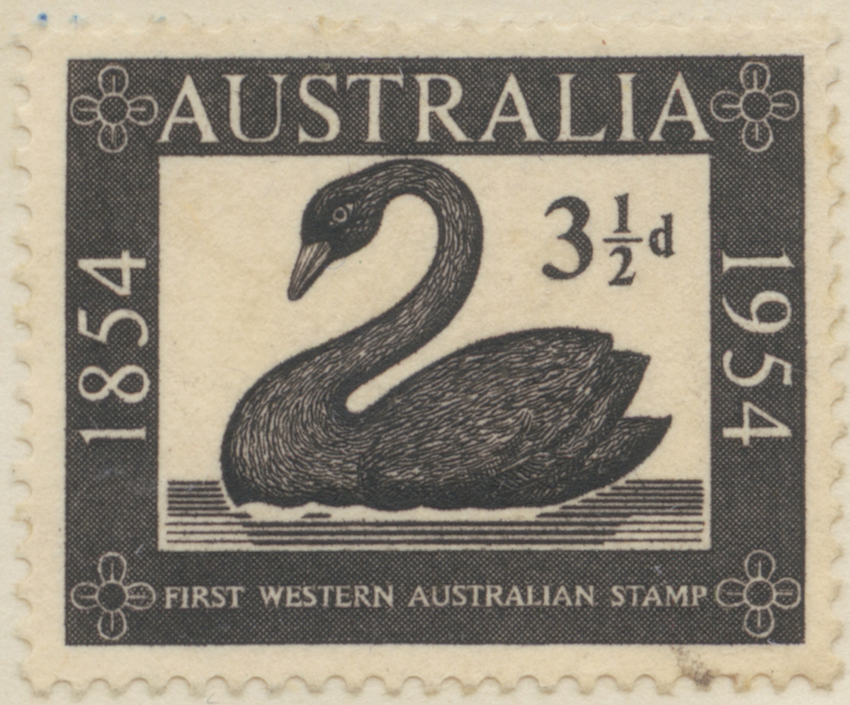 Frimärke från Australien, 1954. Motiv av Svan "West-Australiens Frimärken 100 år: 1854-1954."