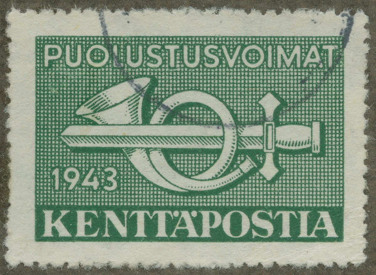 Frimärke från Finland, 1943. Motiv av Posthorn Vapen Svärd Finsk militärpost.
