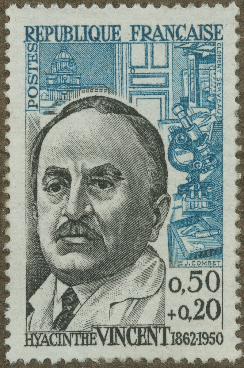 Frimärke från Frankrike, 1962. Motiv av Dr. Hyacinthe Vincent 1862-1950 Fransk bakteriolog. Läkare
