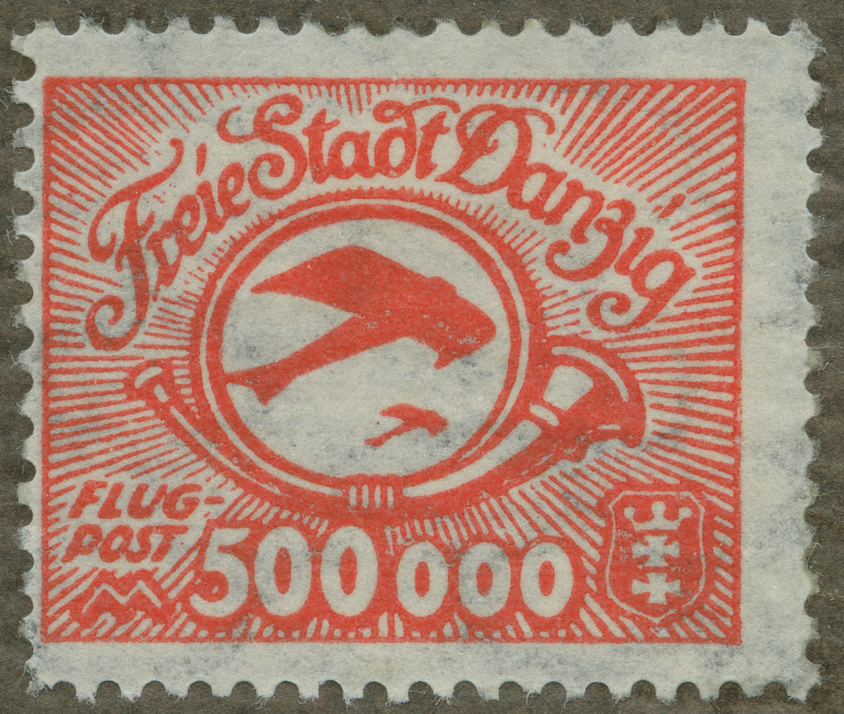 Frimärke från Danzig, 1923. Motiv av Monoplan och posthorn Symboler för flygpost