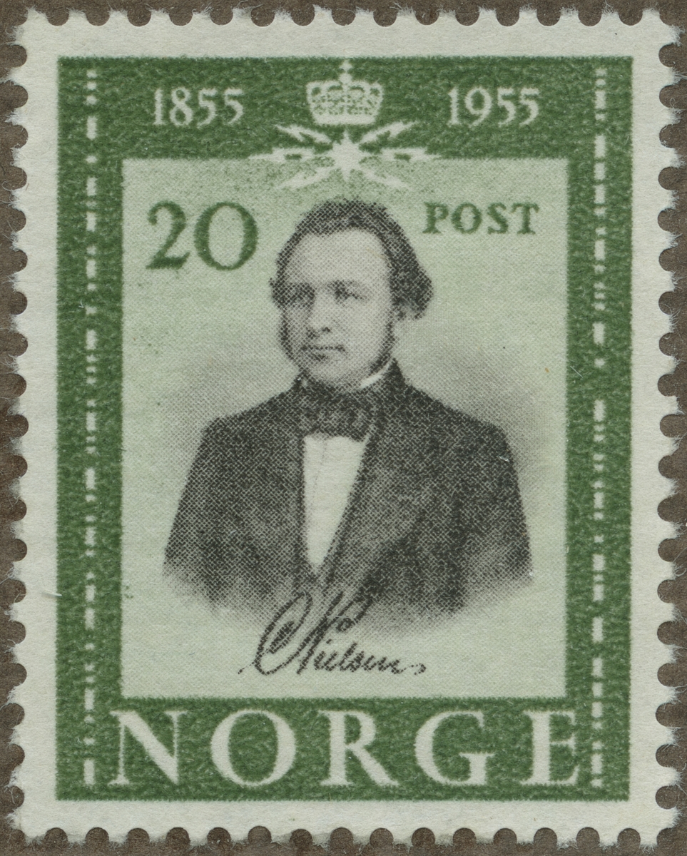 Frimärke från Norge, 1955. Motiv av C. Nielsen Norsk telegrafdirektör -Norges telegraf 100 år. 1855-1955-