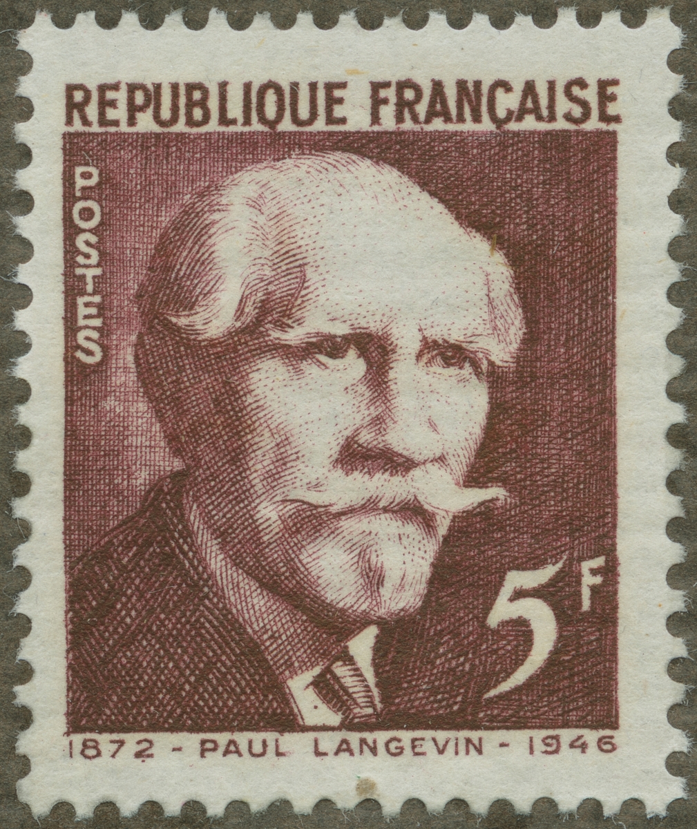 Frimärke från Frankrike, 1948. Motiv av Paul Langevin: 1872-1946 Fransk fysiker, professor. Molekylstruktur av gaser. Teori om magnetism.