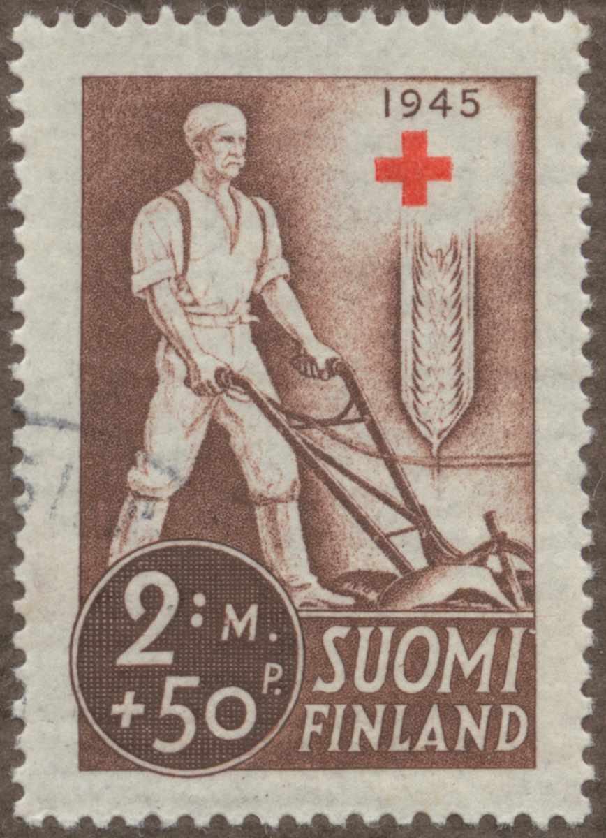 Frimärke från Finland, 1945. Motiv av Finskt plöjningsarbete "-Serie till förmån för Röda Korset-"
