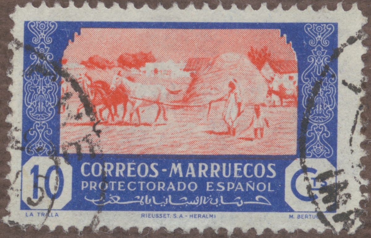 Frimärke från Spanska Marocko, 1944. Motiv av Tröskning i Spanska Marocko: Vete