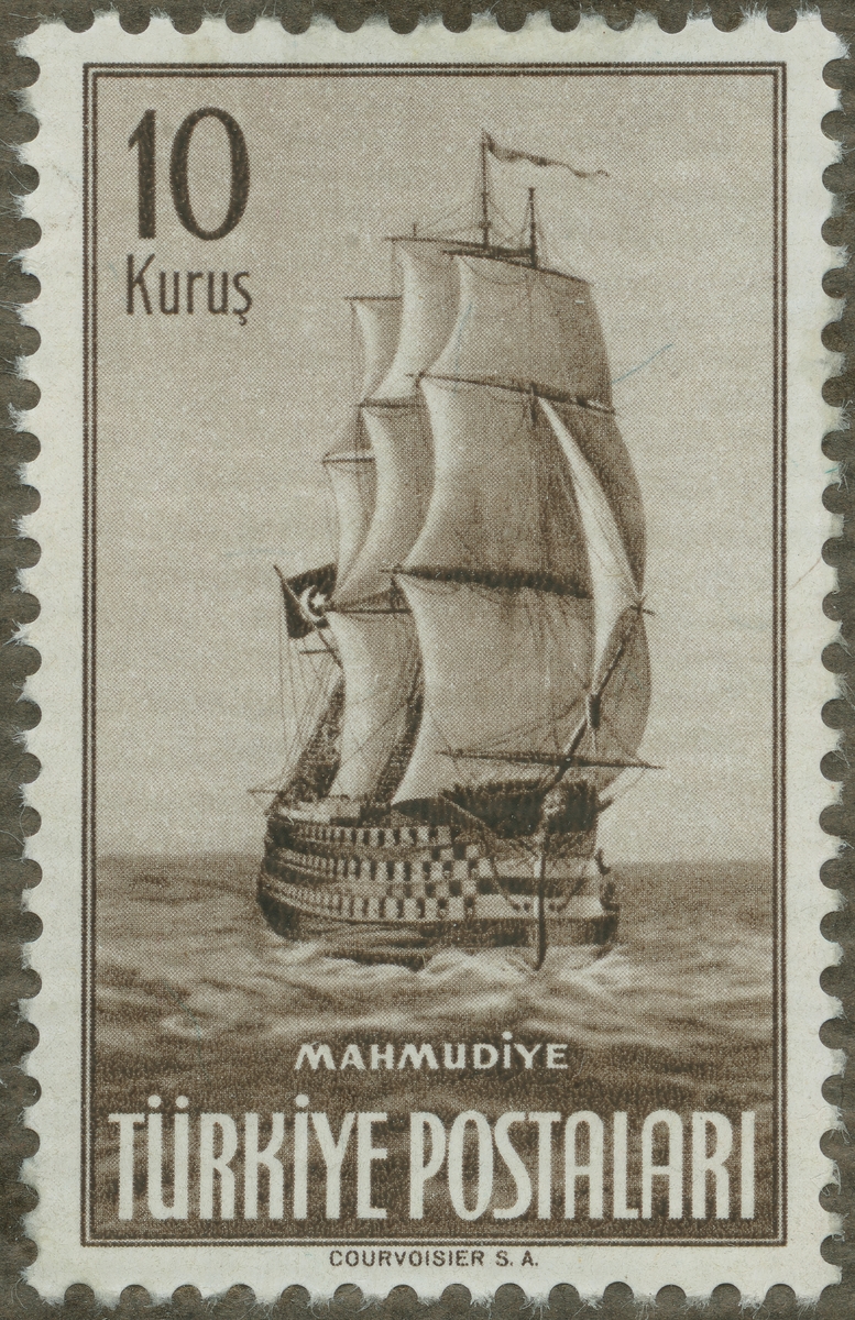 Frimärke från Turkiet, 1949. Motiv av Turkiska fregatten "Mahmudiye" -Flottans Dag 1 juli 1949-