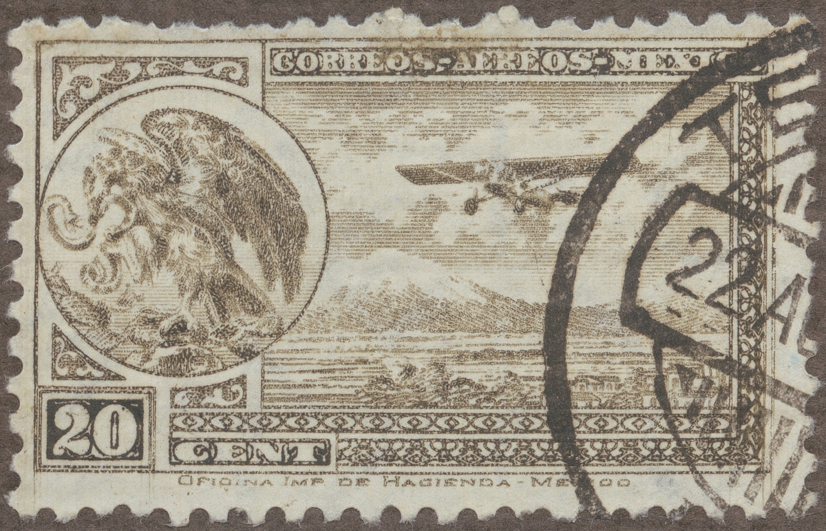 Frimärke från Mexiko, 1929. Motiv av Monoplan över landskap. Örn: symbol för flypost