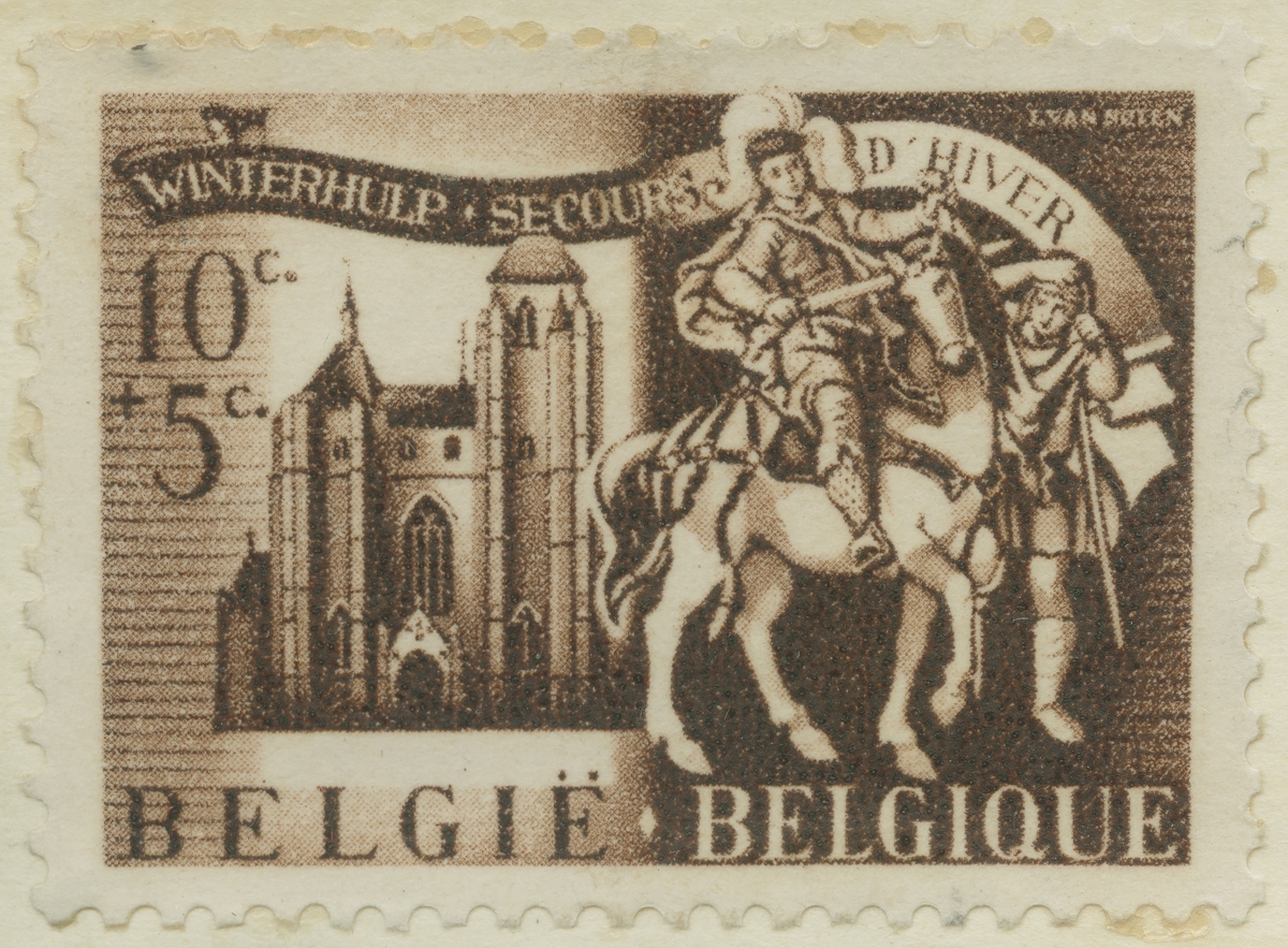 Frimärke från Belgien, 1943. Motiv av St. Léonard Kyrkan i Léau. "Serie till förmån för vinterhjälpen".