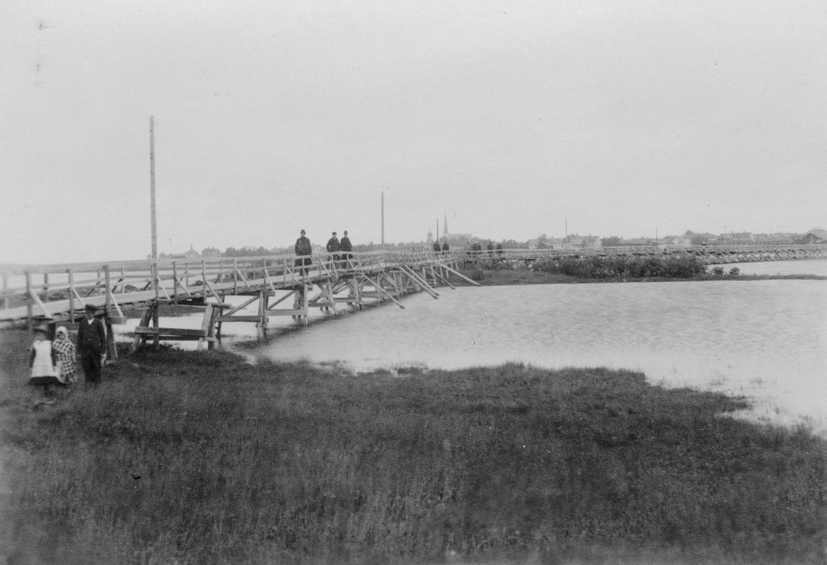 Fotografi från samlingen Gellivararesan 1890. Text på baksidan: Gångbro över Torneå elfs vestra gren från Haparanda till Finska Torneå. Riksgränsen går tvärs öfver denna bro. Vattnet här af mycket ringa djup. Egenliga Torneå elf går på finsk område.