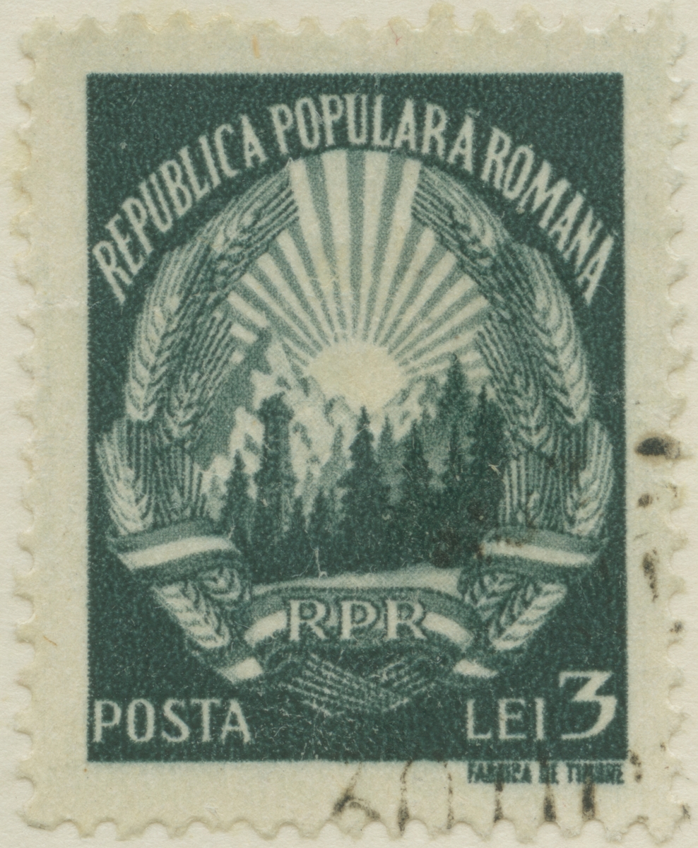 Frimärke ur Gösta Bodmans filatelistiska motivsamling, påbörjad 1950. Frimärke från Rumänien, 1948. Motiv av Uppgående sol. "-Symbol för folkrepubliken-"