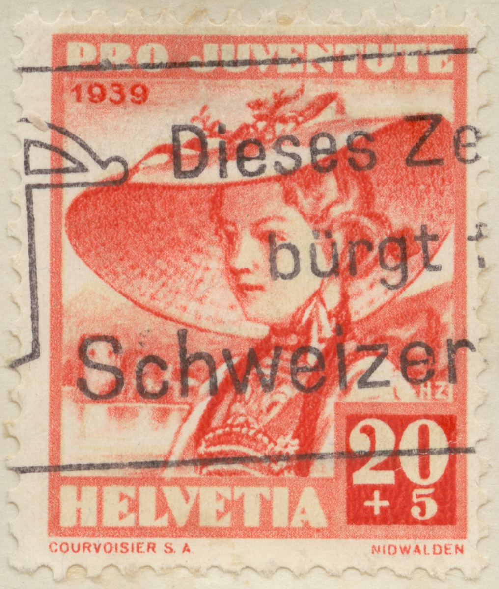 Frimärke från Schweiz, 1939. Motiv av kvinnodräkt, Nidwalden.