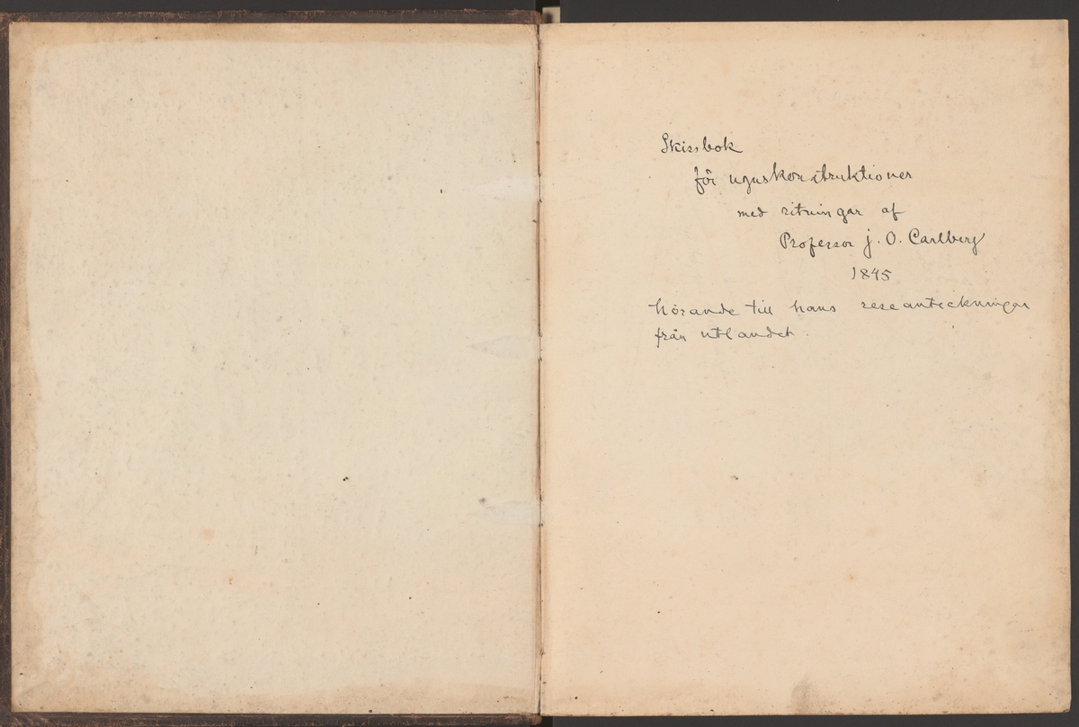 Titel: J.O. Carlberg. Skissbok för ugnskonstruktioner med ritningar av professor J.O. Carlberg 1845, hörande till hans reseanteckningar från utlandet. Ämnesordnade handlingar av bergshistoriskt och bergstekniskt innehåll. Ur Carl Sahlins bergshistoriska samling.