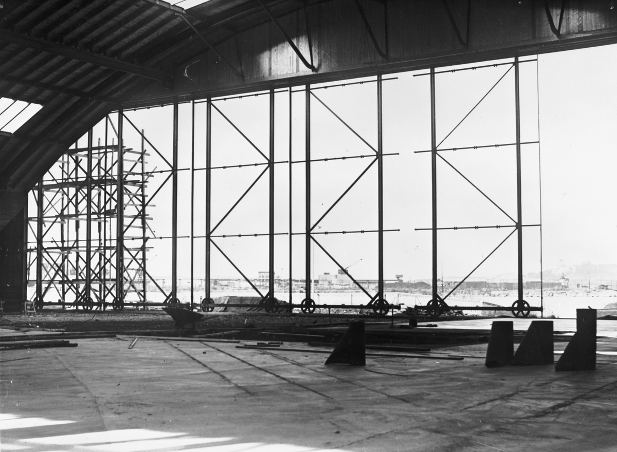 Interiör av den jättelika hangaren i Stockholm. Under uppförande.