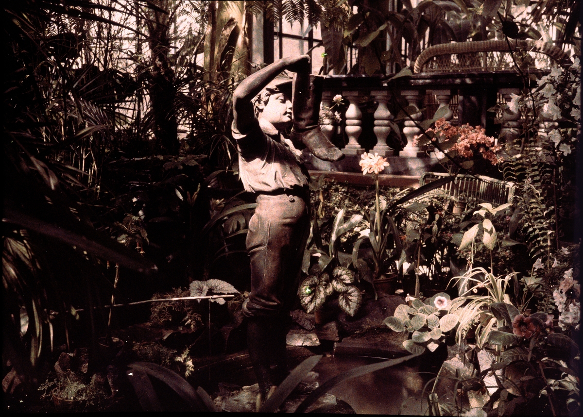 Lumières-autokrom. "Gosse med stöveln i vinterträdgården", dr. Römpler, Görbersdorf Schlesien. Fotograferat i april 1910, med f/24, 5 min. exponering.