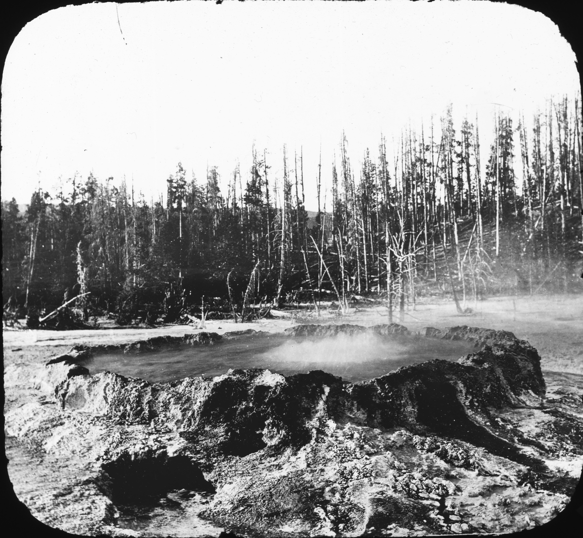 Skioptikonbild med motiv av het underjordisk källa, möjligen i Yellowstone Nationalpark.