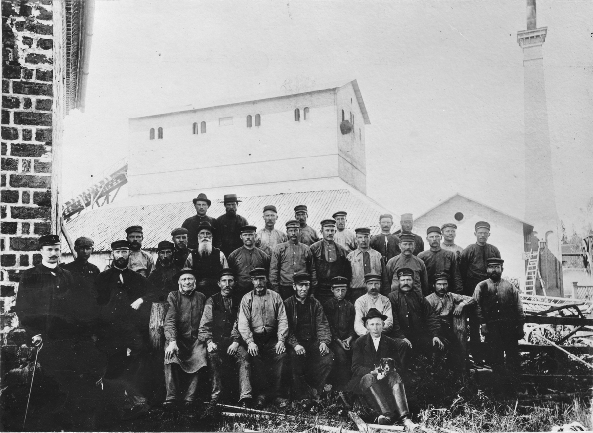 Tobo Masugn. Hyttan och arbetarekåren 1896. Mannen längst till vänster är bruksbokhållaren Eugen Beausang.