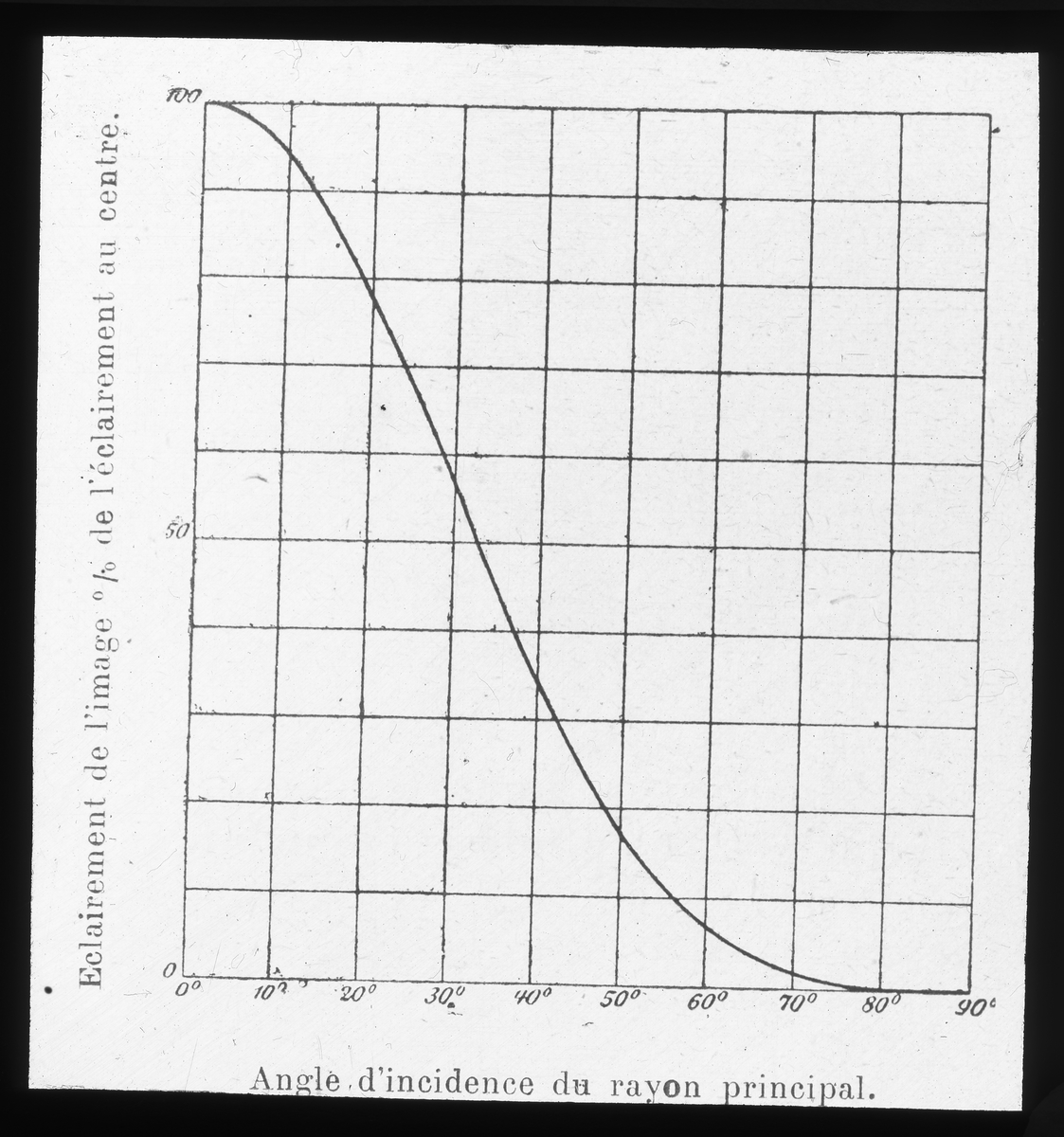 Kurva för:[lodrätt] belysning av bilden, procentuellt belyst jämfört med belysningen i mitten av bilden. [vågrätt] infallsvinkeln för den huvudsakliga strålen.