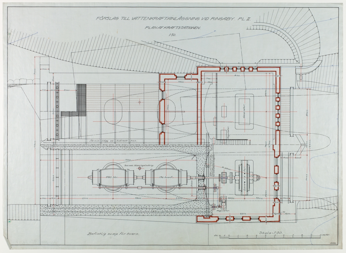 Ritning över förslag till vattenkraftanläggning vid Ringaby.