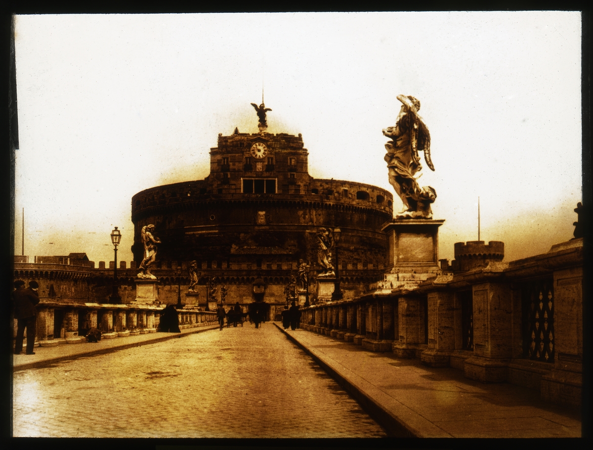 Skioptikonbild från institutionen för fotografi vid Kungliga Tekniska Högskolan. Motiv föreställande Castel Sant Angelo (Änglaborgen). Ursprungligen kejsar Hadrianus mausoleum (stod färdigt 139 e Kr.) Bilden är troligen tagen av John Hertzberg under en resa i Europa. (Silveromvandling, pga fukt och luft, kan ha gett bilden den gulbruna färgen).