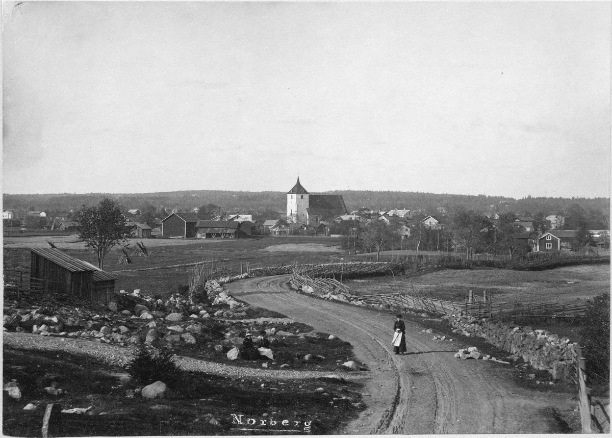 Vy över samhället i Norberg. Kvinna på landsväg.