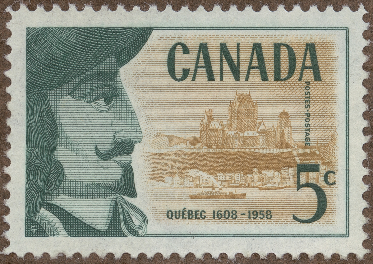Frimärke från Canada, 1938. Motiv av (t.v.) Samuel de Champlain Fransk upptäcktsresande och kolonigrundläggare. 1567-1635. Utforskade stora delar av Kanadas: S.t Lawrence floden m.m. (i bakgrunden) Château Frontenac i staden Quebec, som Champlain grundade 1608. 350-årsminne. 1608-1958.
