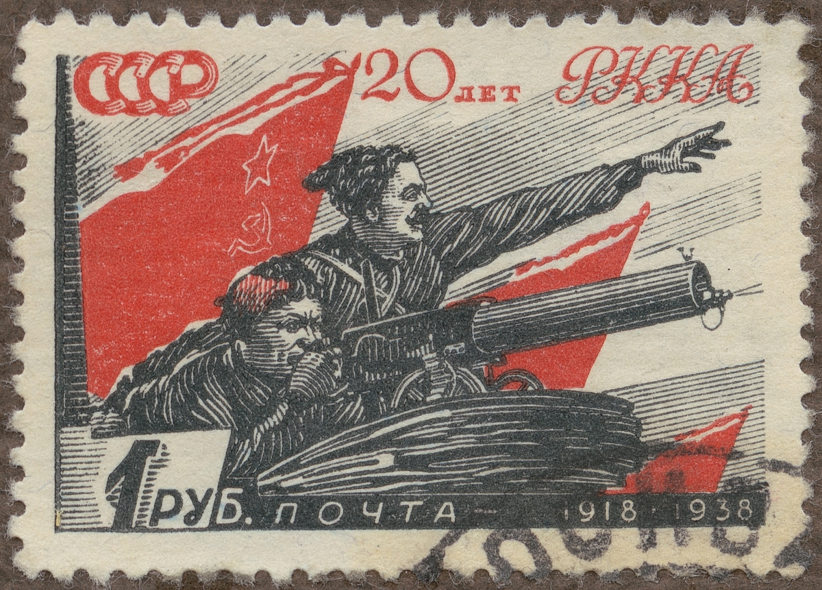 Frimärke från Ryssland, 1938. Motiv av Rysk kulspruta -20-årsminne av Arbetare- och Bönders Röda Här: