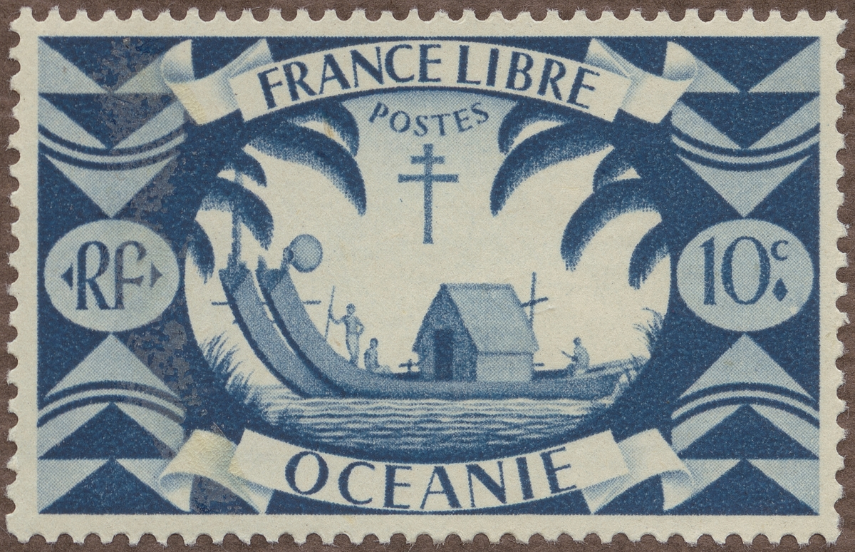 Frimärke från Oceanien, 1942. Motiv av båt med stuga - dubbel kanottyp-