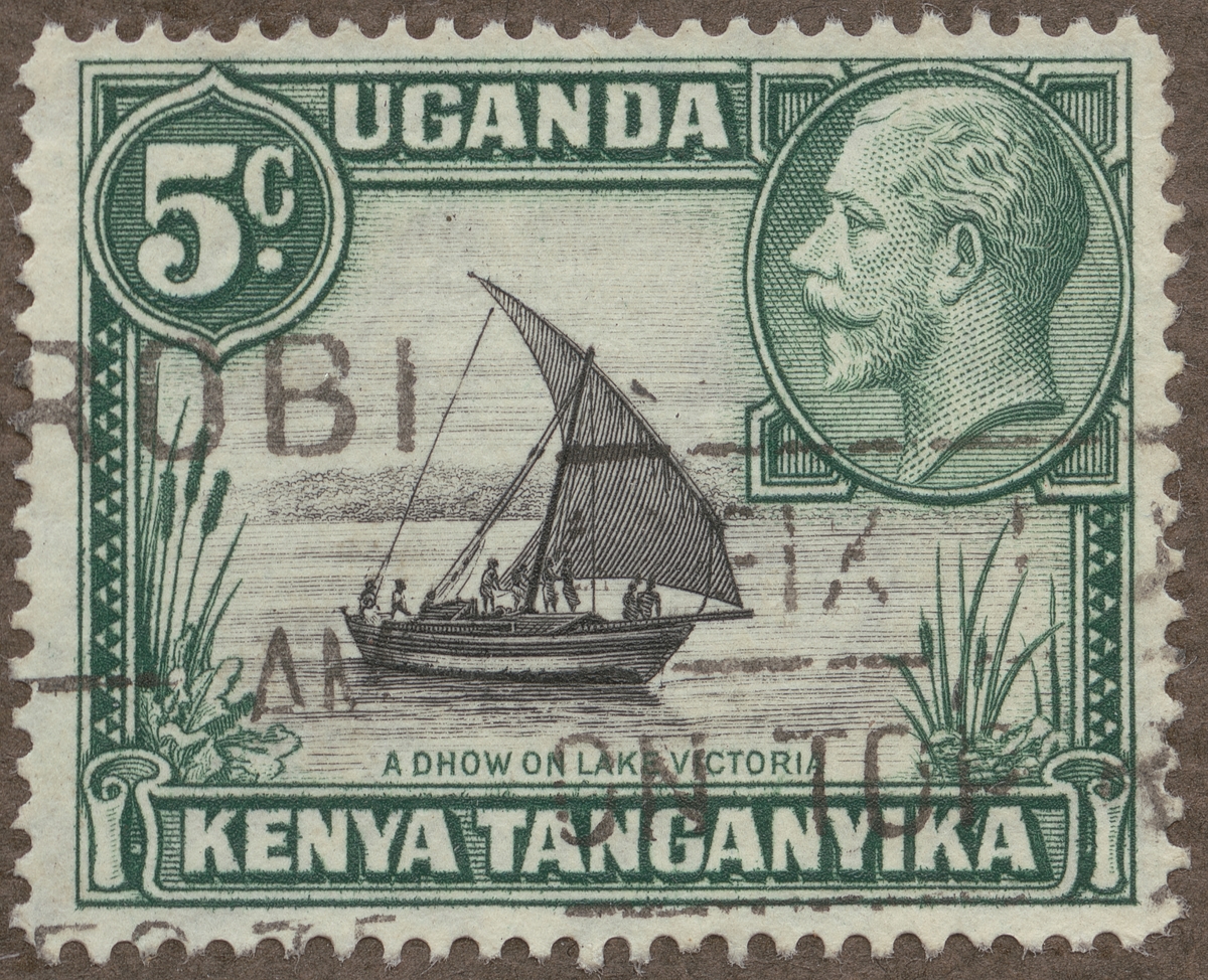 Frimärke från Kenya-Uganda-Tanganyika, 1935. Motiv av traditionell segelbåt- s.k. "dhow" på Victoriasjön i mellersta Afrika. (t.h.): Kung George V.