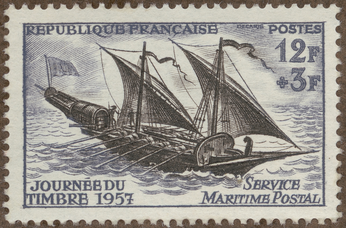 Frimärke från Frankrike, 1957. Motiv av Gammal Postbåt 12 roddare 2 latinsegel Frimärkets Dag 1957