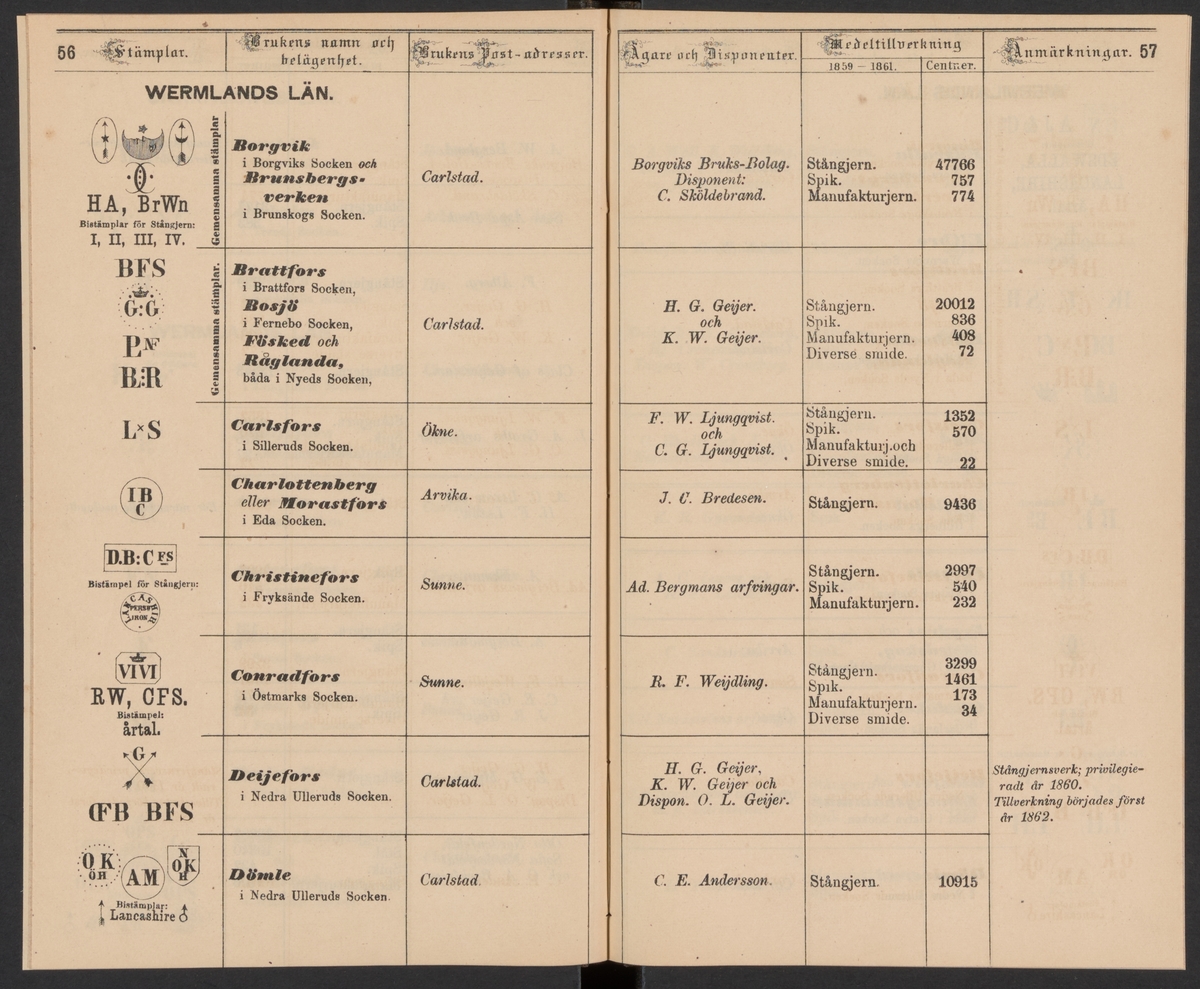 Stämpelbok för Svenska Järnverken 1864, med supplement 1867.