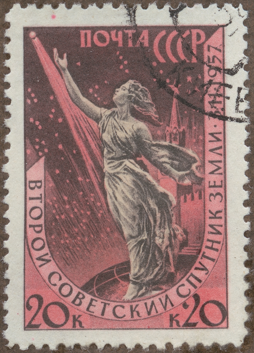 Frimärke från Ryssland, 1958. Motiv av Den andra ryska satellit: "Sputnik II" 3 november 1957.