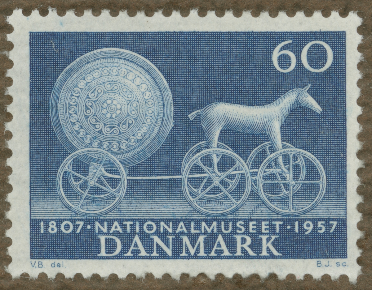 Frimärke från Danmark, 1957. Motiv av "Solvagnen": Solskivan dragen av häst. "Danmarks Nationalmuseum 150 år: 1807-1957".