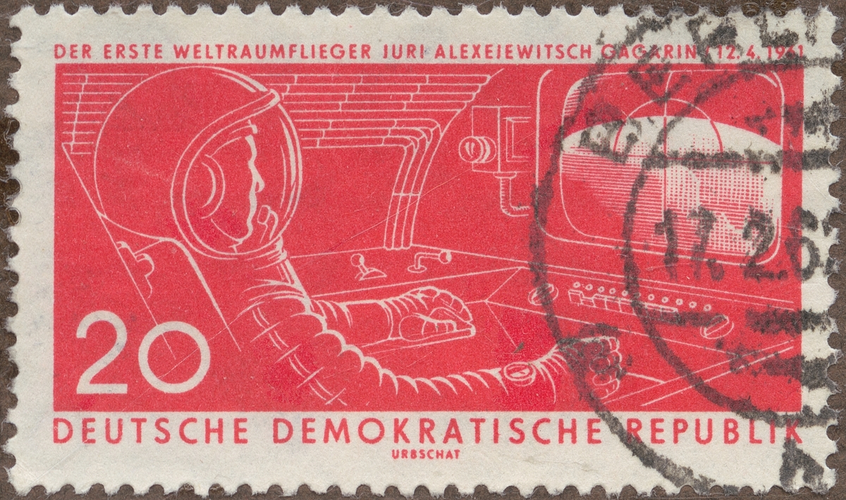 Frimärke från Östtyskland, 1961. Motiv av Gagarin i rymdkabinen. (inskription): Den förste rymdflygaren runt jorden: Juri Alexeiewitsch Gagarin 12:4: 1961.
