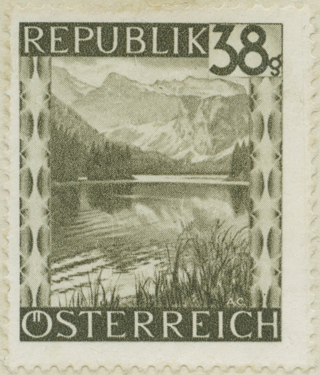 Frimärke ur Gösta Bodmans filatelistiska motivsamling, påbörjad 1950. Frimärke från Österrike, 1945. Motiv av Landbath Sjön