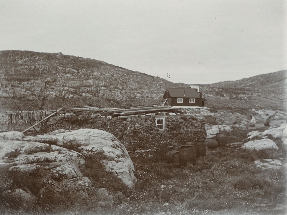 Fotografi från expedition till Grönland. Motiv av bergslandskap med ett litet trähus i mitten. På huset vajar en nationsflagga. I förgrunden står och ligger ett antal träfat/trätunnor.