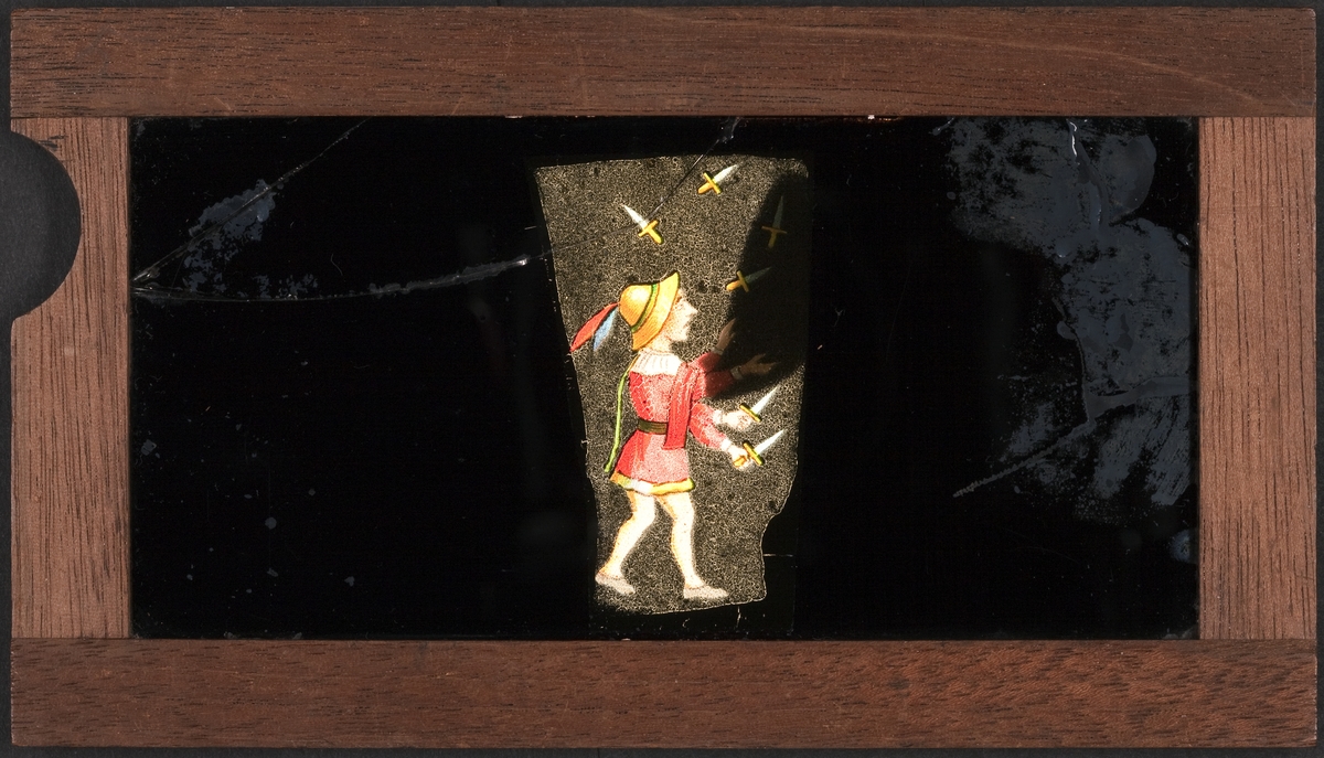 Ljusbild för laterna magica med motiv av liten man i hatt som jonglerar med knivar.